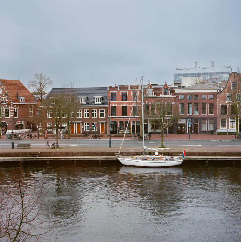 Ik sta voor een raam in een appartement op de 2e etage in Haarlem en kijk uit over het Spaarne.