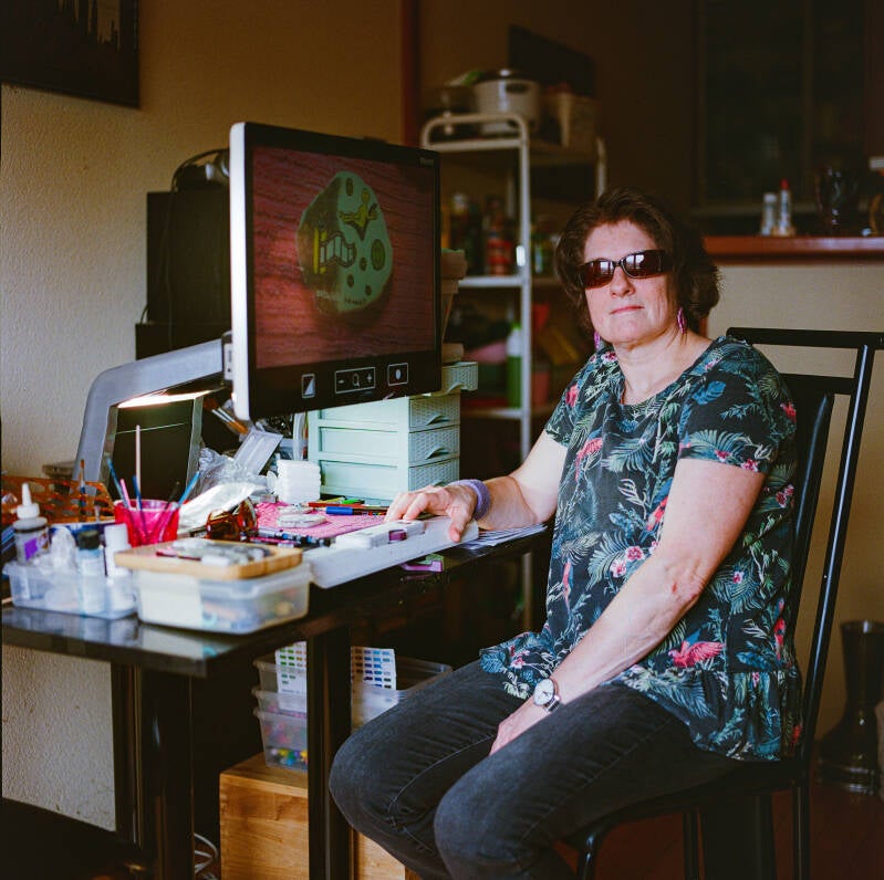 Adri in haar huiskamer met de beeldschermloep die ze onder andere gebruikt om de Happy Stones te maken.